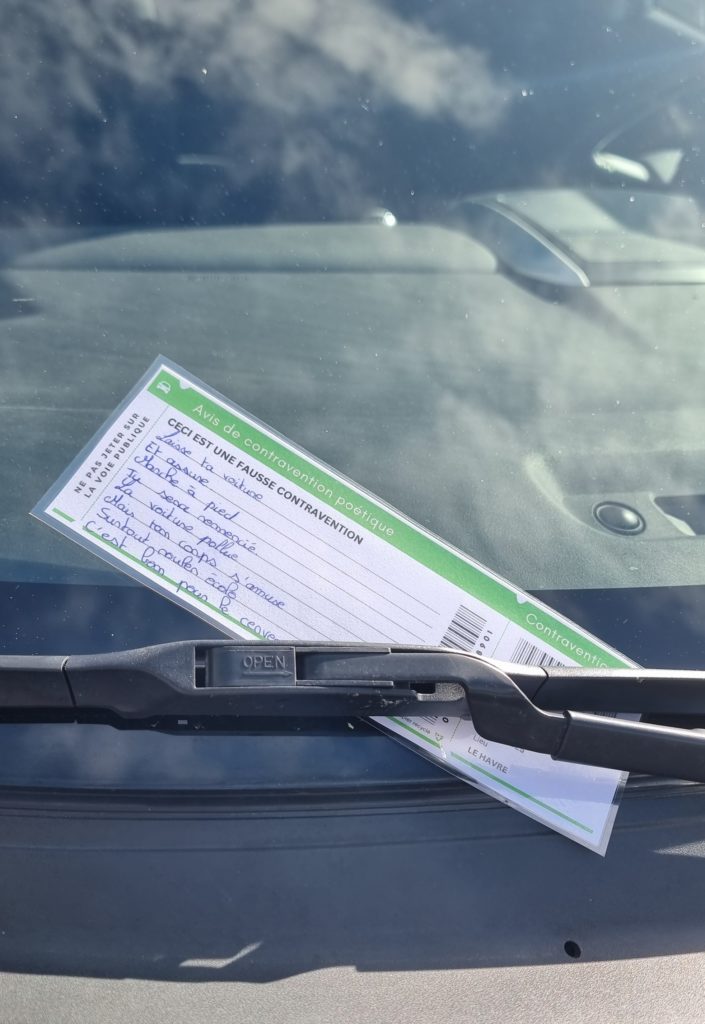Avec l’accord du Proviseur et de la Police Municipale du Havre, ils ont donc joué le rôle de policiers et « verbalisé » avec très grand plaisir tous les véhicules stationnés sur le parking du lycée en déposant leurs contraventions sur chaque voiture. Une amende fixée à une bonne dose de réflexion écologique !