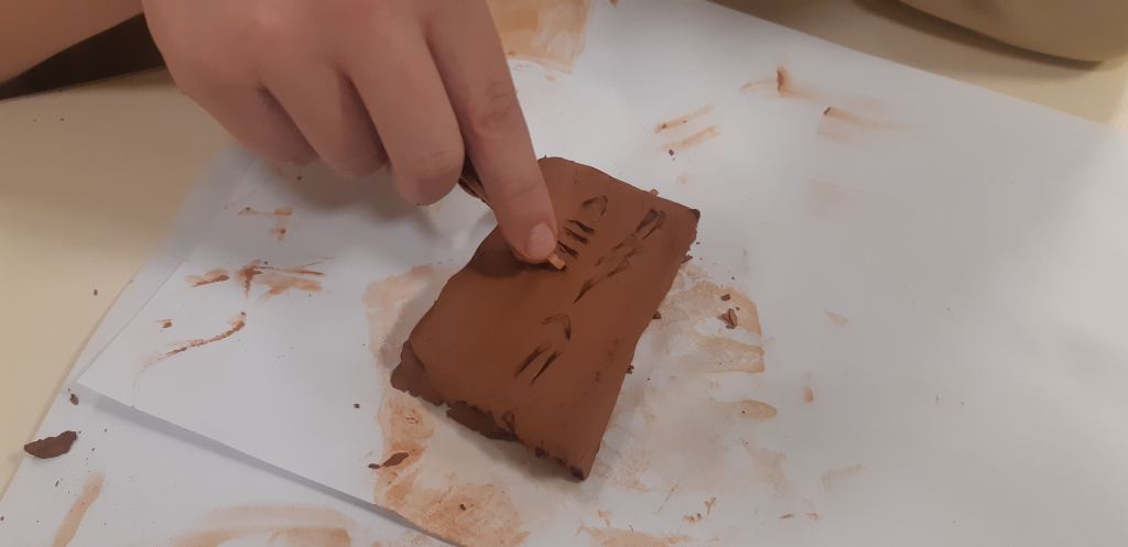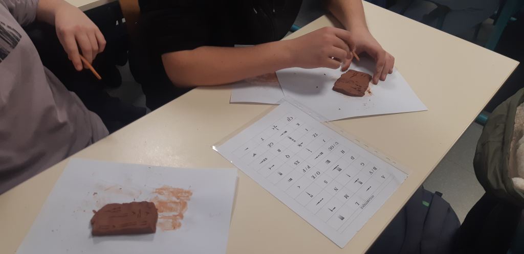 Les élèves ont commencé par s’initier à l’écriture ougaritique : munis de calames, ils ont tracé des signes cunéiformes sur des tablettes d’argile, découvrant ainsi la matérialité des écritures antiques et la dextérité qu’exigeait ce geste.